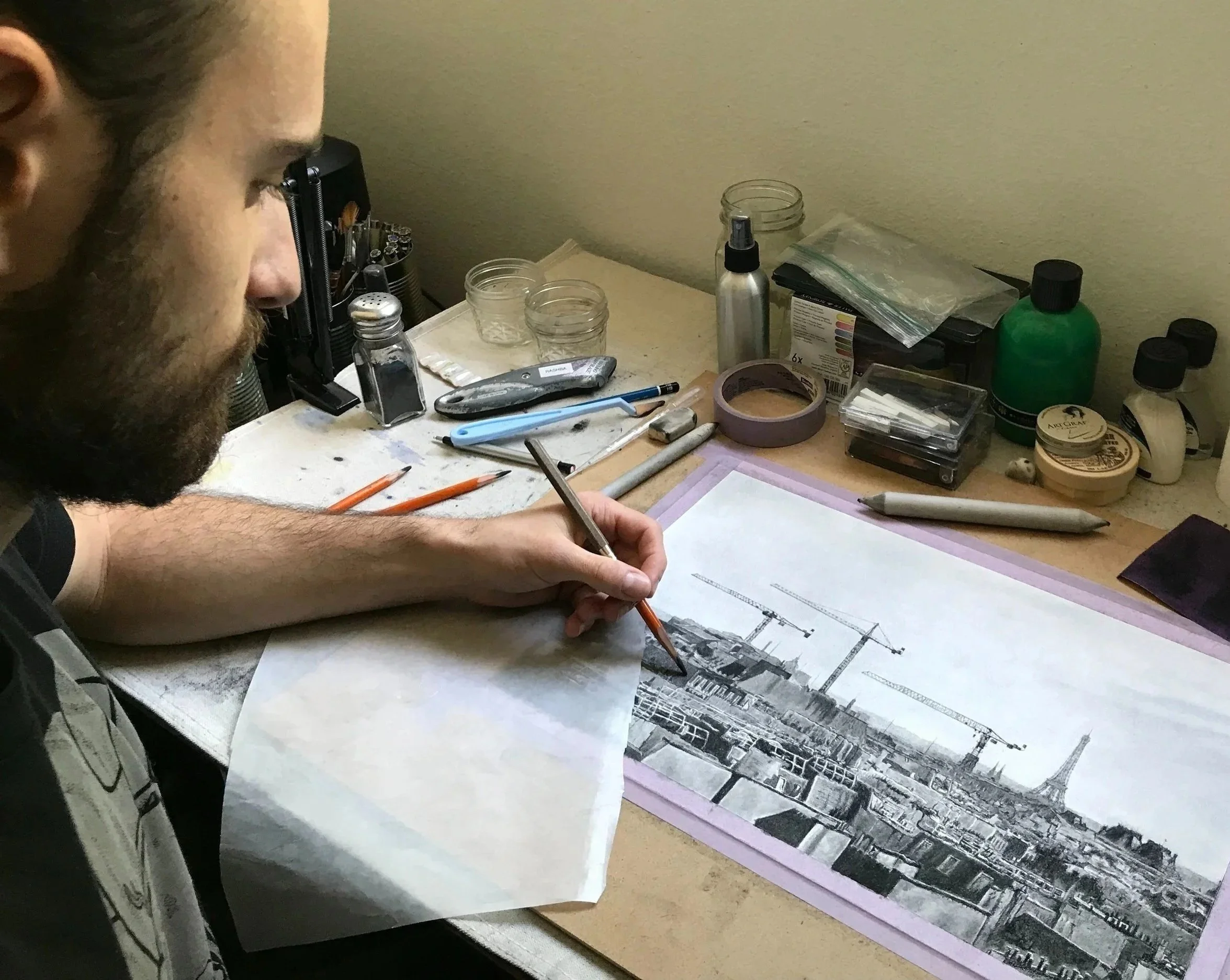 While Rashba’s artistic practice is anchored in tight rendering, over time he has integrated more expressive and suggestive mark-making into his pieces. Pulling from his background in filmmaking, he aims to create emotional yet ambiguous compositions that reveal fragments of kinetic and unsettled subjects. He applies this approach to representations of architecture, natural landscapes, the human figure and wildlife.