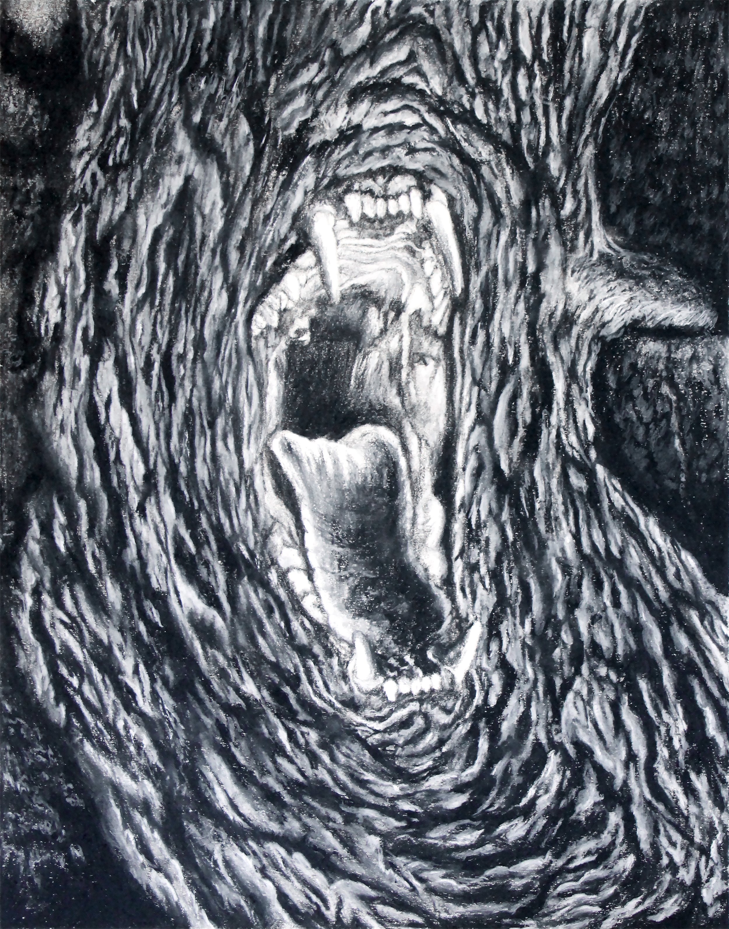 This is the second piece in a triptych of animal mouth subjects. I found the anatomy of open animal mouths fascinating and wanted to transform them by isolating them and placing them in a strange textural context. In this case, we have a lion's mouth surrounded by pouring lava, which becomes a cave-like aperture when isolated from the animal's face—transforming this anatomical study into an abstract textural piece.