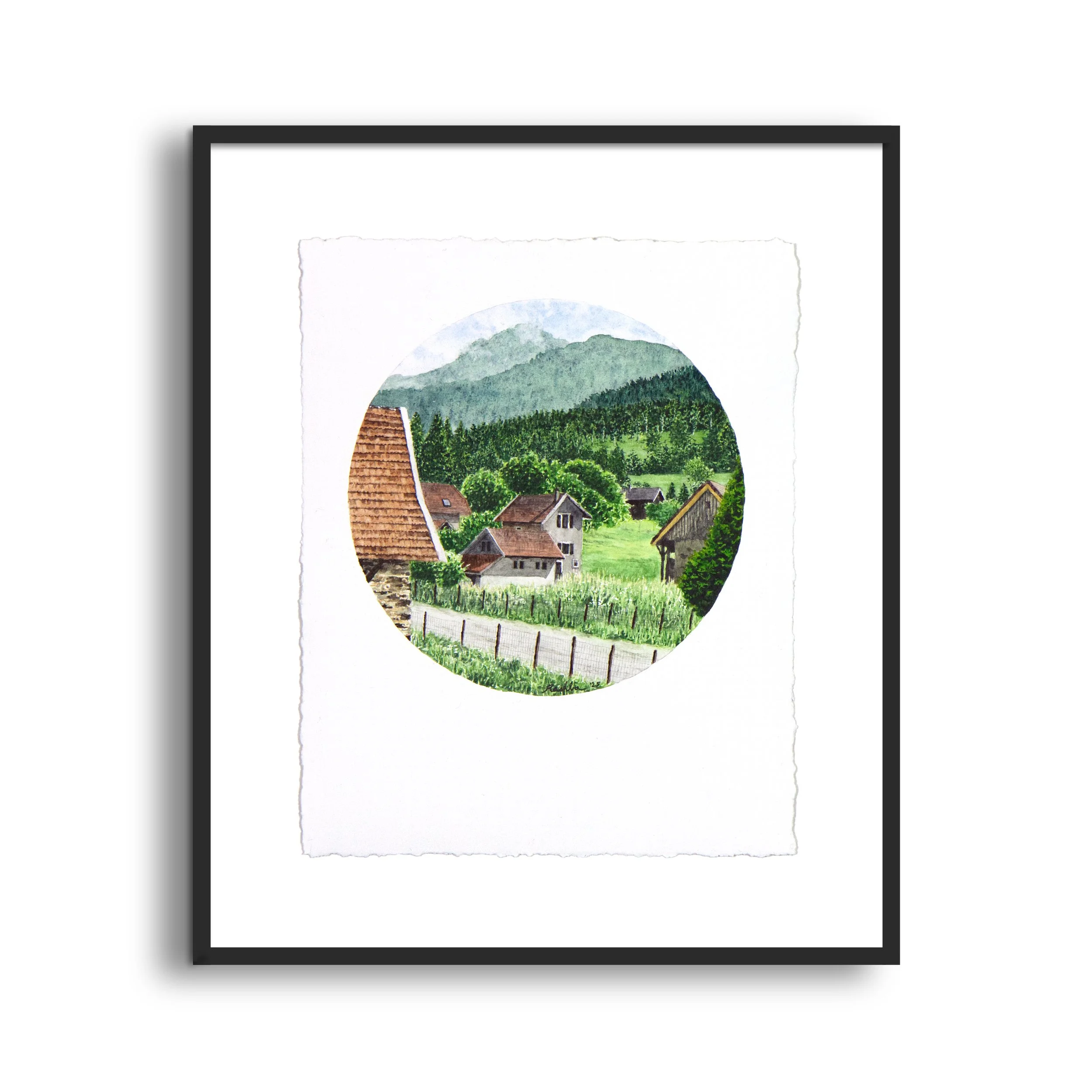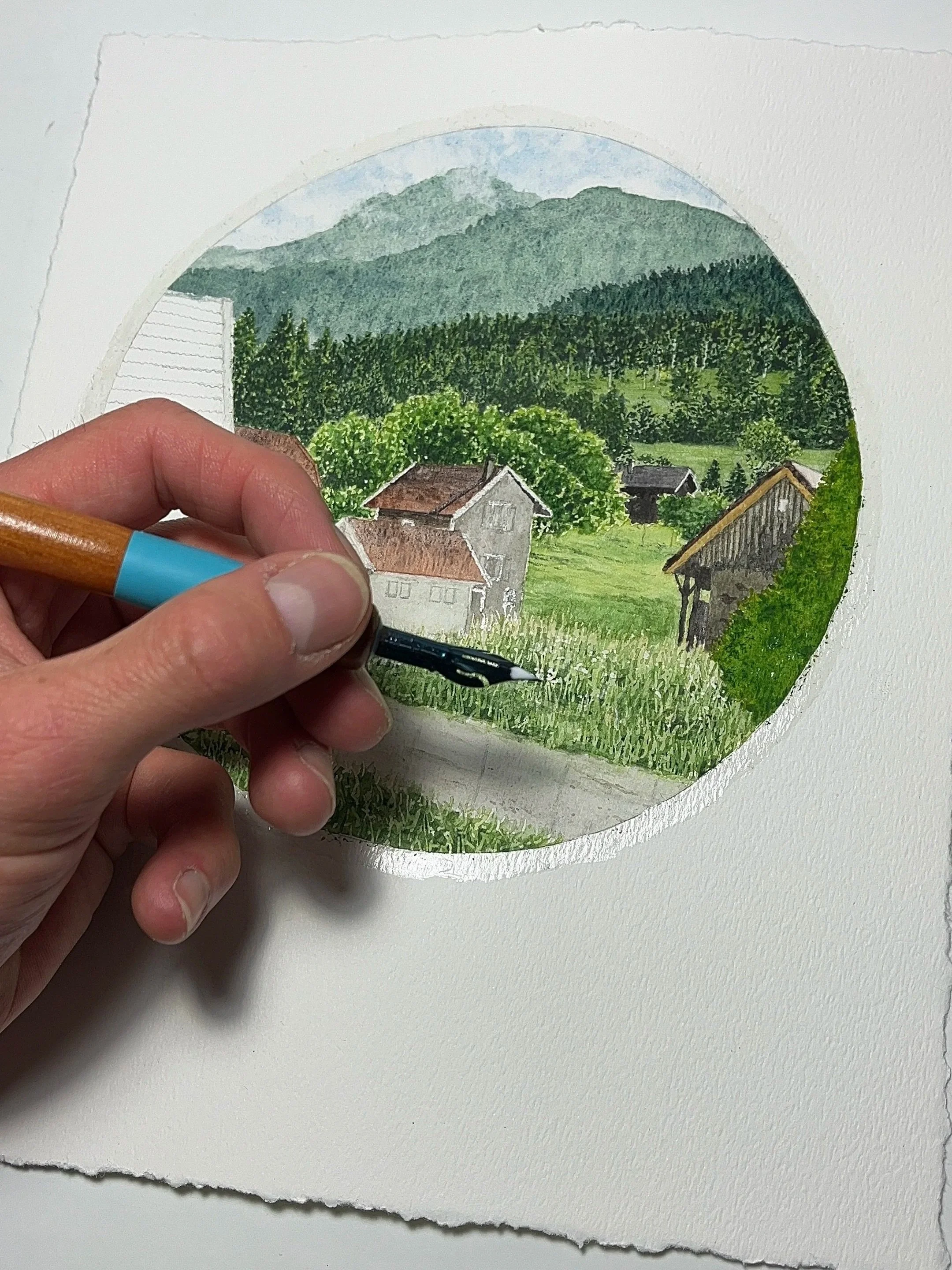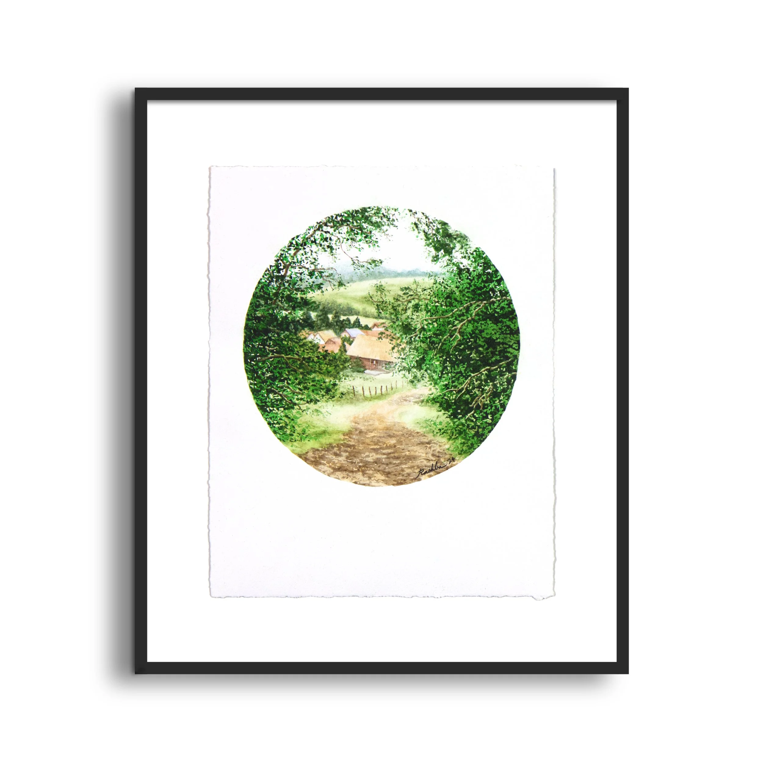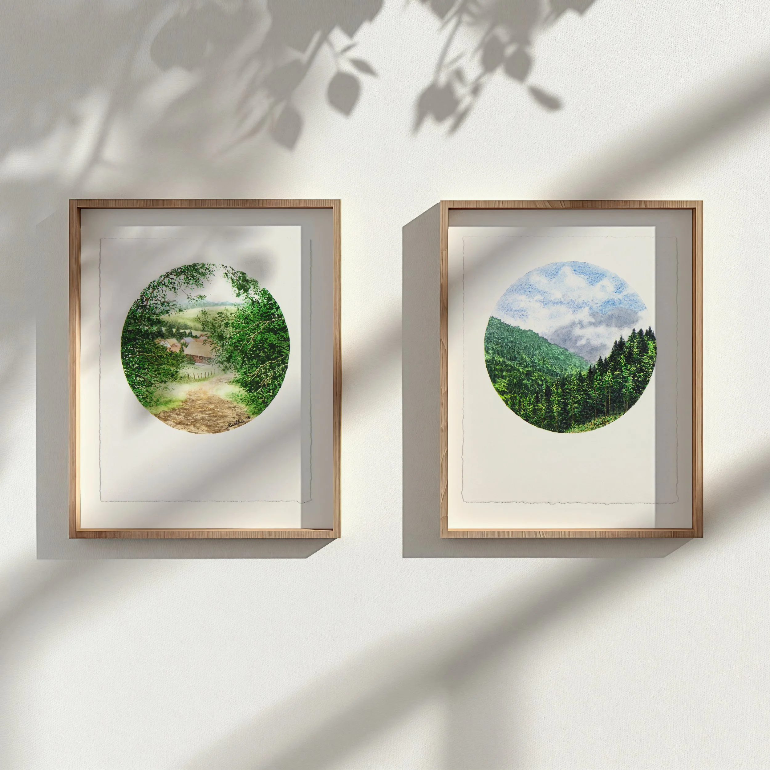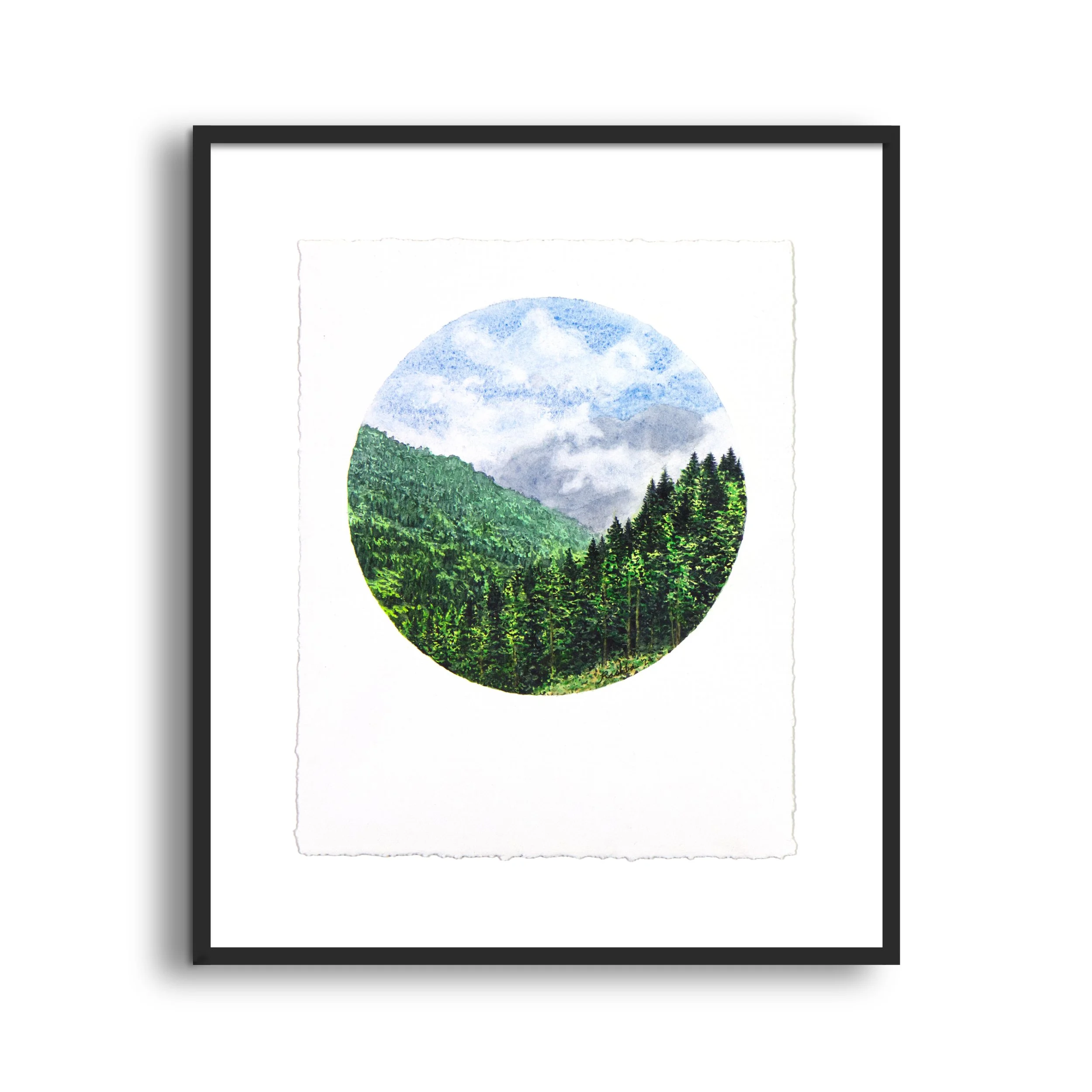 The circular formatting of these paintings is meant to mimic the look and proportions of a circular polaroid photo, but enlarged and painted onto deckled edge paper. This created an exciting way to formally depict these images that evoked a tactile and nostalgic quality, as if we are looking through a portal into a memory. It’s a continuation of my interest in mimicking the experimental and unusual qualities of various forms of film photography through my watercolors.