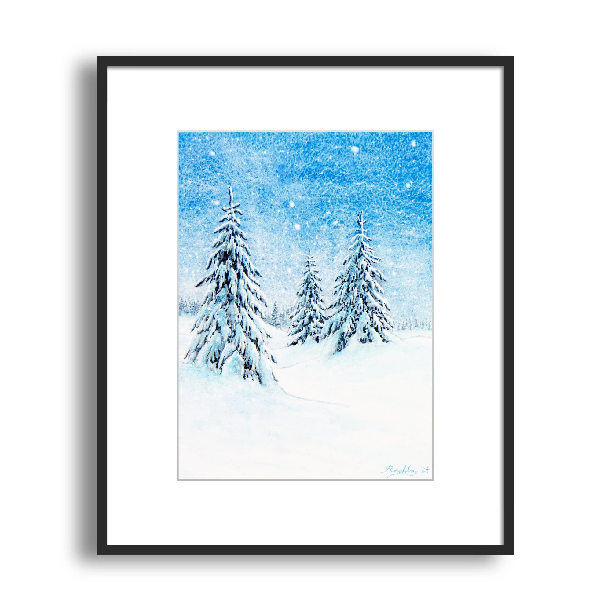 For this collection, I thought it would be fun to start very zoomed in on the beautiful details of a snow covered Evergreen tree, and with each subsequent painting zoom out further and further to a wider view of the winter landscape. There is a whole world of detail and beauty to appreciate within each view of the wintery world.